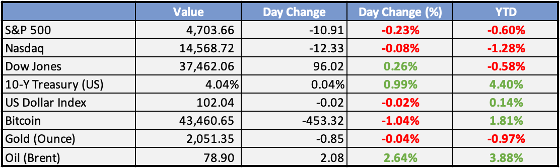 U.S. stocks ended mostly lower overnight, with the tech-heavy Nasdaq Composite slipping 0.6% and the S&P 500 easing 0.3%.