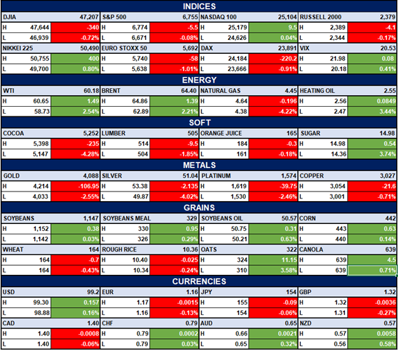 The table below shows that there was Mixed performance. The U.S. indices slightly down (DJIA -0.72%, S&P 500 -0.08%), while Nasdaq 100 edged up 0.04% and Nikkei 225 gained 0.80%; European indices fell (Euro Stoxx 50 -1.01%, DAX -0.91%). Oil prices rose (WTI +2.54%, Brent +2.21%), while metals dropped sharply (Gold -2.55%, Silver -4.02%, Platinum -2.46%), and soft commodities showed mixed results with sugar +3.74% and cocoa -4.28%. USD strengthened slightly; EUR and JPY slipped; grains generally rose with oats +3.58%, canola +0.71%, corn +0.14%, while wheat fell -0.43%.