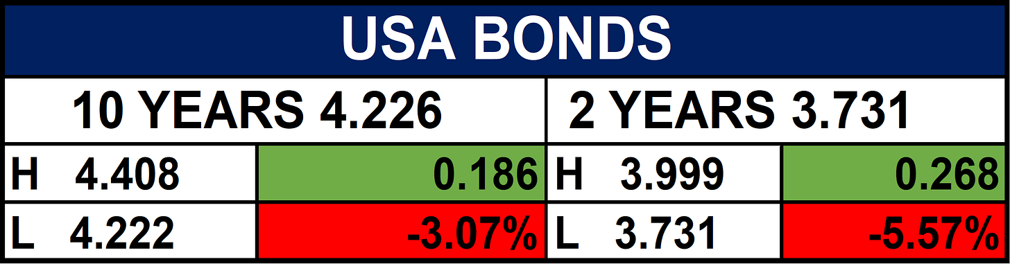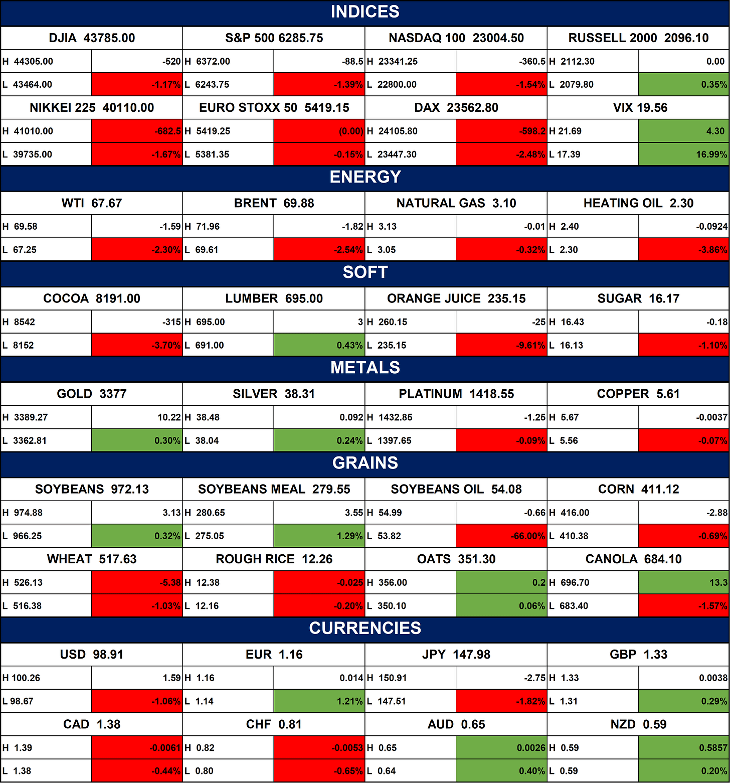 The table below Depicts that the Global markets declined amid risk-off sentiment, with equities, energy, and soft commodities falling, while volatility spiked and safe-haven assets like gold edged higher. The U.S. dollar weakened, boosting other major currencies, and grains showed mixed performance.