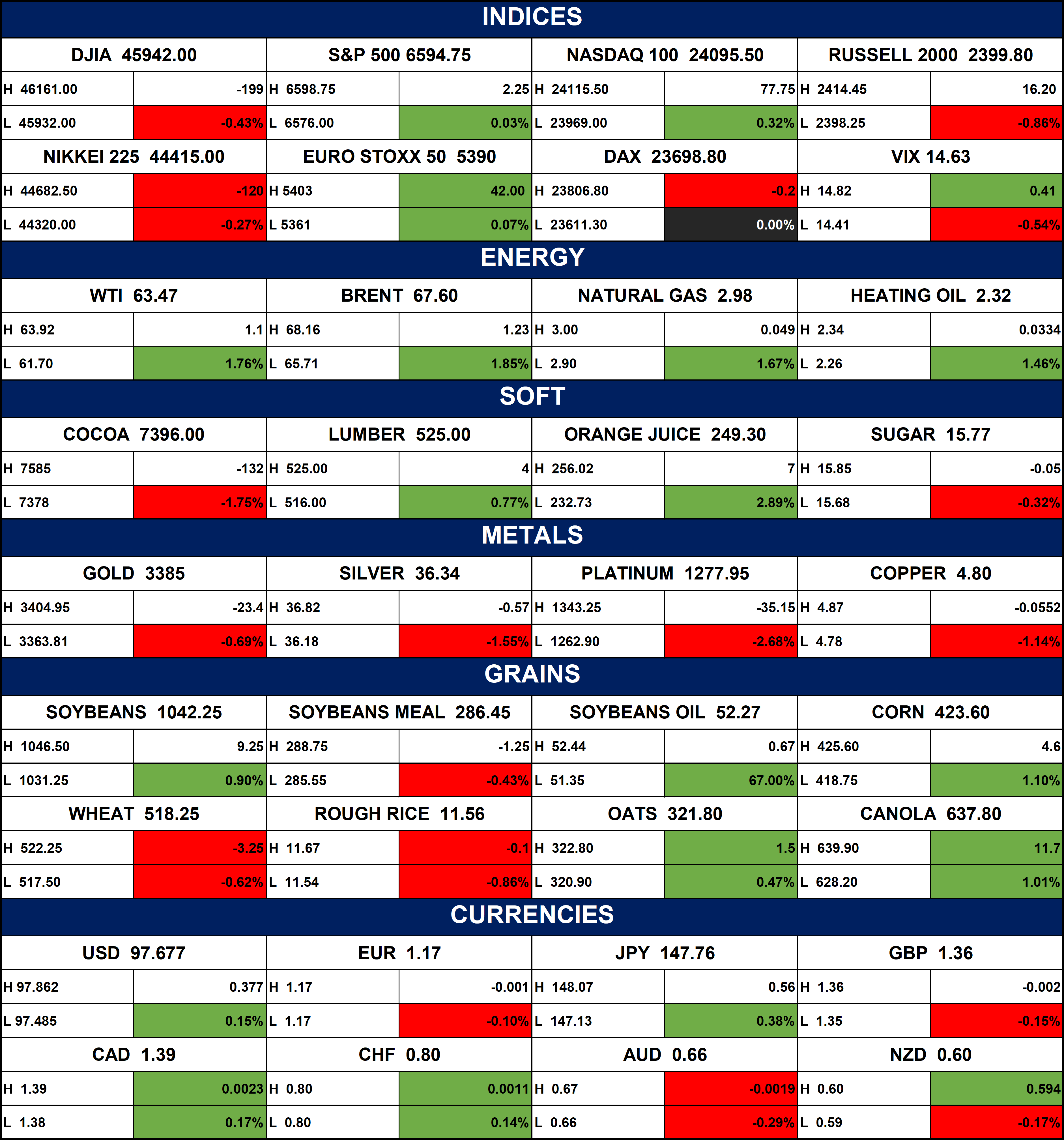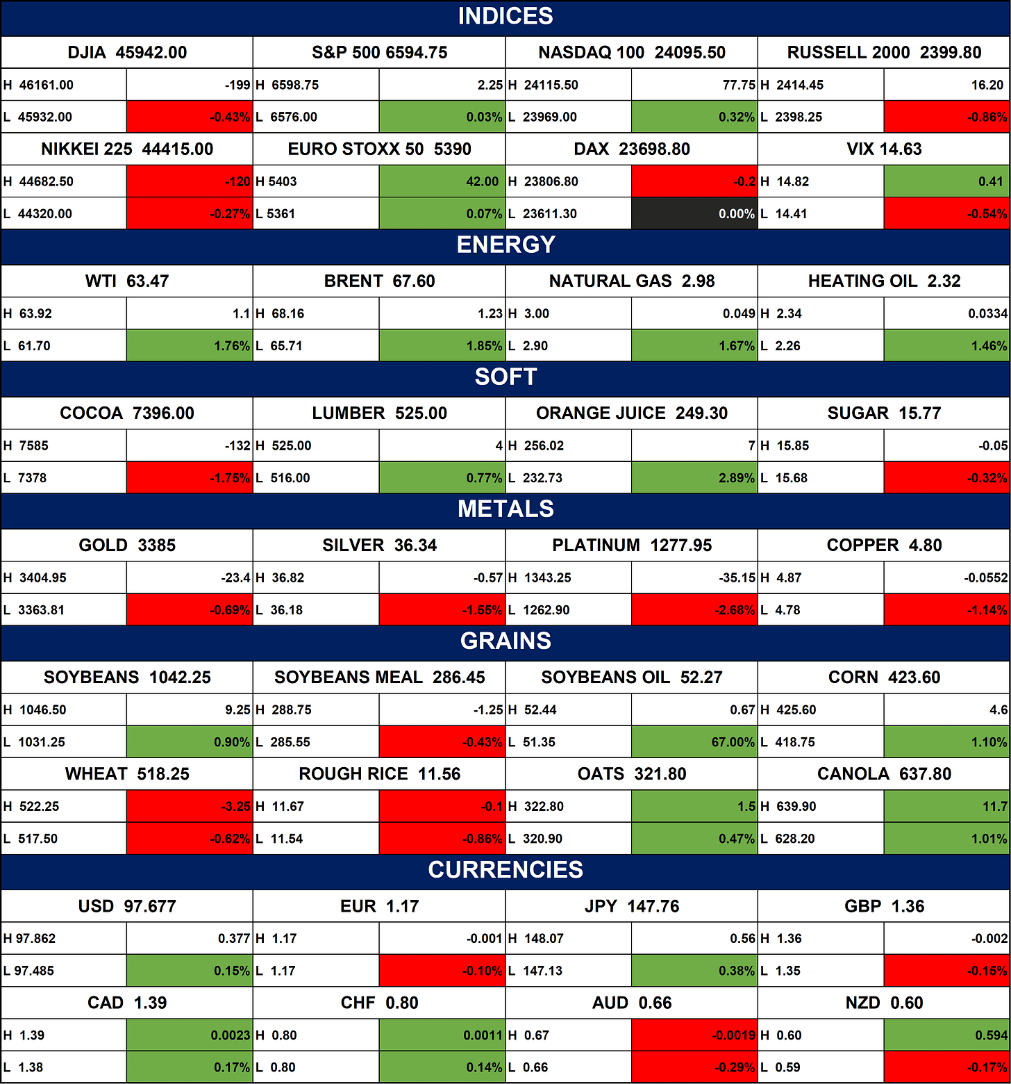The table below Depicts that the Global markets were mixed, with U.S. equities showing slight weakness while European indices held steady. Energy prices rose strongly, led by oil and natural gas, while grains such as soybeans and corn also gained. In contrast, metals declined, with gold, silver, and platinum all lower. Soft commodities were mixed, as orange juice rallied but cocoa fell. In currencies, the U.S. dollar strengthened slightly, supported by gains in the yen and Canadian dollar, while the euro, pound, and Australian dollar slipped. Overall, momentum favored energy and grains, while metals weighed on sentiment.