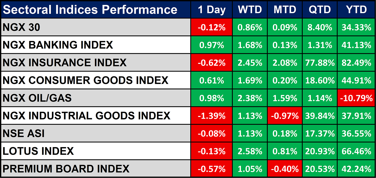 The table below shows that the NGX sectoral indices show mixed daily moves, but performance is strong overall. Insurance and Lotus indices are the biggest gainers year-to-date, while Oil/Gas is the only sector in negative territory. Overall, the market remains broadly positive with Insurance leading growth.