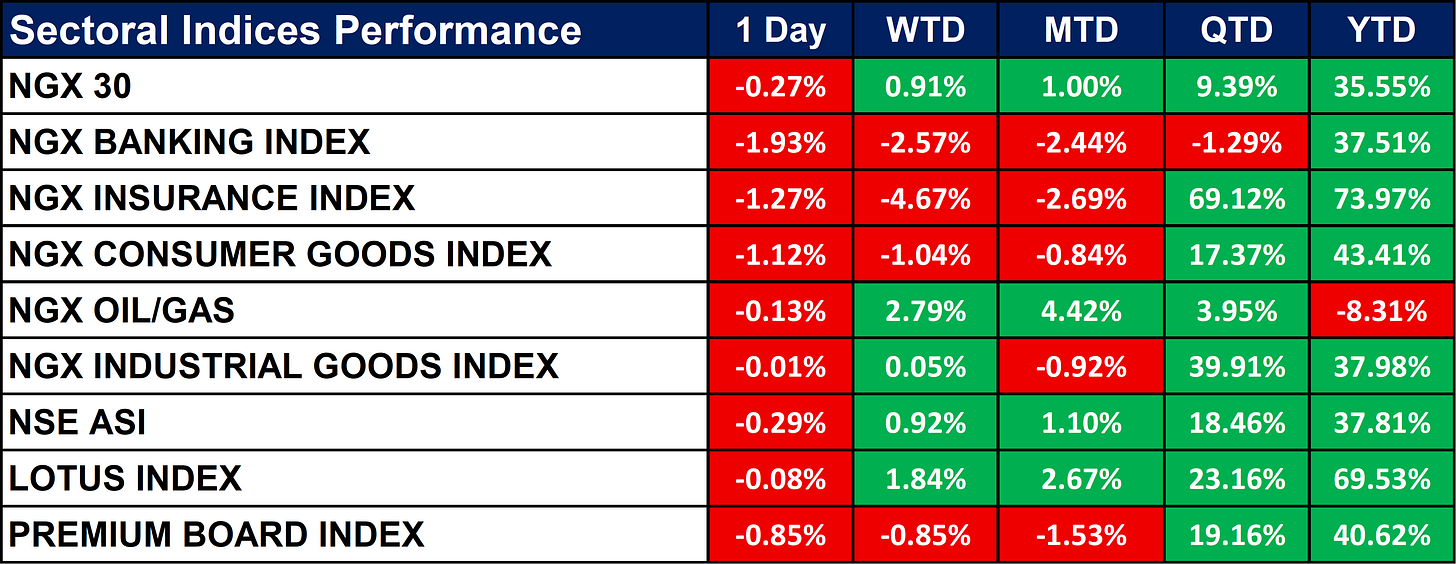 The table below shows that the The NGX sectoral indices closed mostly negative on a 1-day basis, led by Banking (-1.93%) and Insurance (-1.27%). Week-to-date, Oil/Gas (+2.79%) and Lotus (+1.84%) gained, while Insurance (-4.67%) was the worst performer. Year-to-date, Insurance (+73.97%) and Lotus (+69.53%) lead the market, while Oil/Gas (-8.31%) is the only laggard.