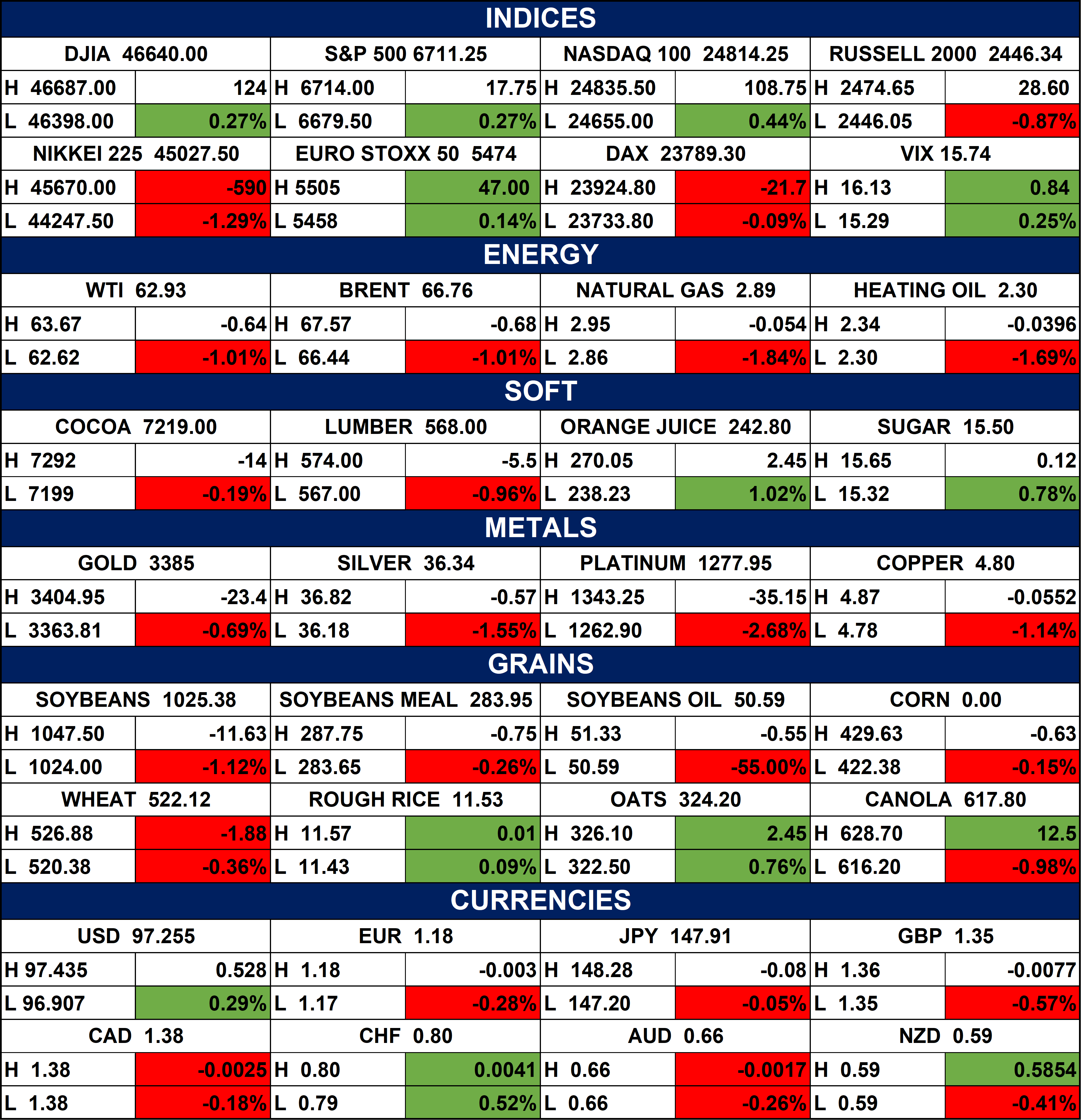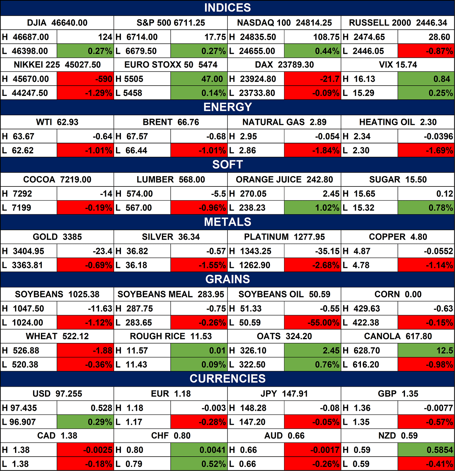 The table below Depicts the Global equities were mixed: U.S. indices gained modestly while Japan’s Nikkei fell sharply. Energy markets slid, with WTI, Brent, and Natural Gas all down, while Orange Juice and Sugar posted gains among soft commodities.