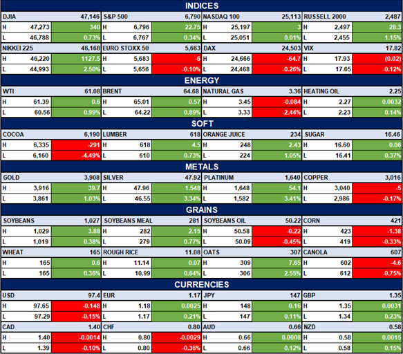 The table below Depicts that the U.S. equities closed mixed, with the DJIA up 0.73%, S&P 500 up 0.34%, and NASDAQ gaining 0.01%, while European markets slipped as the Euro Stoxx fell (-0.10%) and the DAX declined (-0.26%). In commodities, energy prices was mixed with WTI up 0.99%, Brent up 0.89%, and Natural Gas lower by (-2.44%), while metals strengthened, led by Gold up 1.03% and Silver up 3.34%. The U.S. dollar fell slightly( -0.15)%.