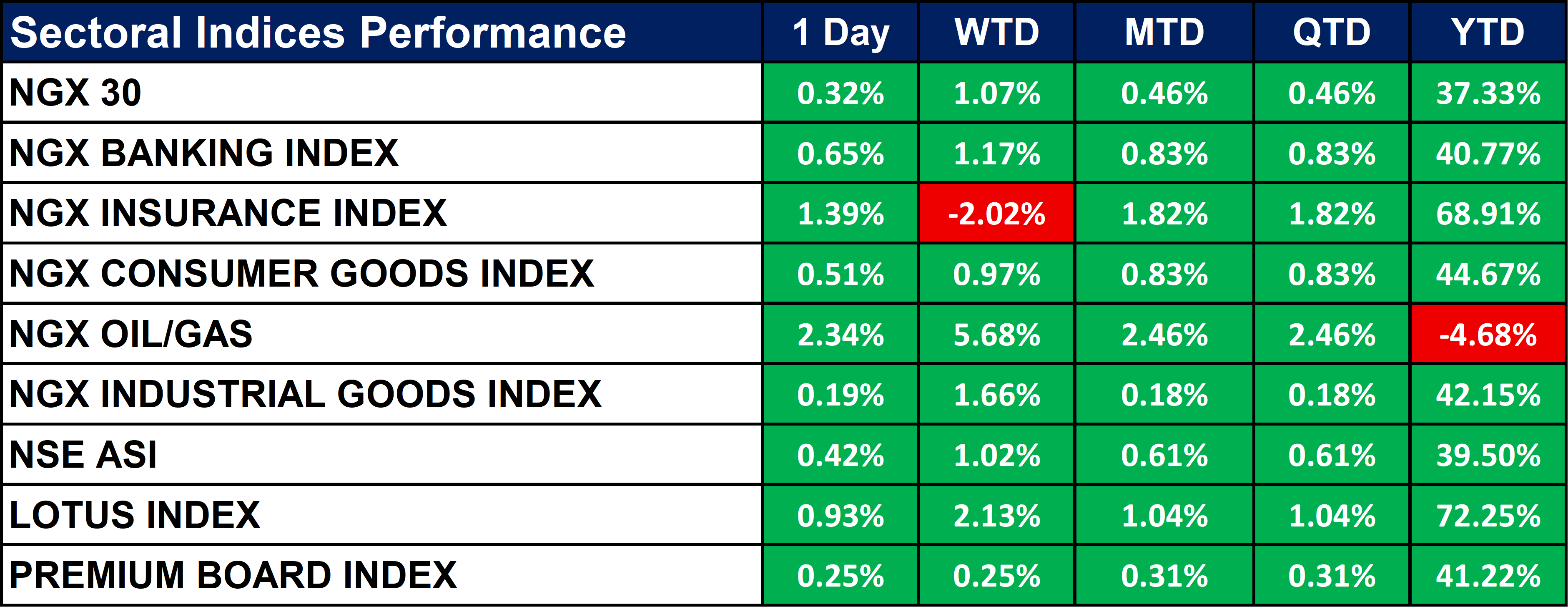 The table below shows that the NGX market closed broadly positive, led by Oil/Gas (+2.34%) and Insurance (+1.39%) on the day. Week-to-date, Oil/Gas gained the most (+5.68%), while Insurance lagged (–2.02%).