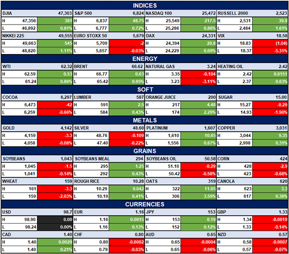 Energy prices rose as WTI (+0.86%) and Brent (+0.95%) gained, while natural gas slipped (-3.11%). Metals and grains were mixed, with platinum (+0.67%) and oats (+3.59%) higher, while cocoa (-0.66%) and wheat (-2.03%) declined.