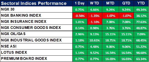 The table below shows that the NGX market advanced broadly, with the NGX Oil/Gas (+2.96%) and Industrial Goods (+1.18%) driving gains. Banking stocks lagged, falling -0.56% amid sectoral weakness. Year-to-date, the Lotus Index (+98.68%) and Insurance (+77.63%) remain the best performers, reflecting strong market breadth.