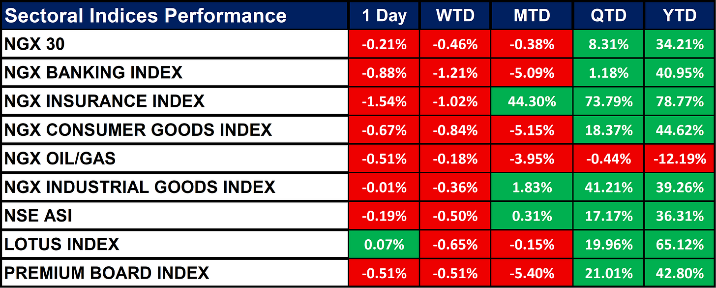 The table below shows that most NGX sector indices declined over the day and week, with the Insurance Index dropping the most. However, performance over the month, quarter, and year remains strong overall. The Insurance, Industrial Goods, and Lotus Index show significant year-to-date gains, while Oil/Gas is the only sector in negative territory for the year.