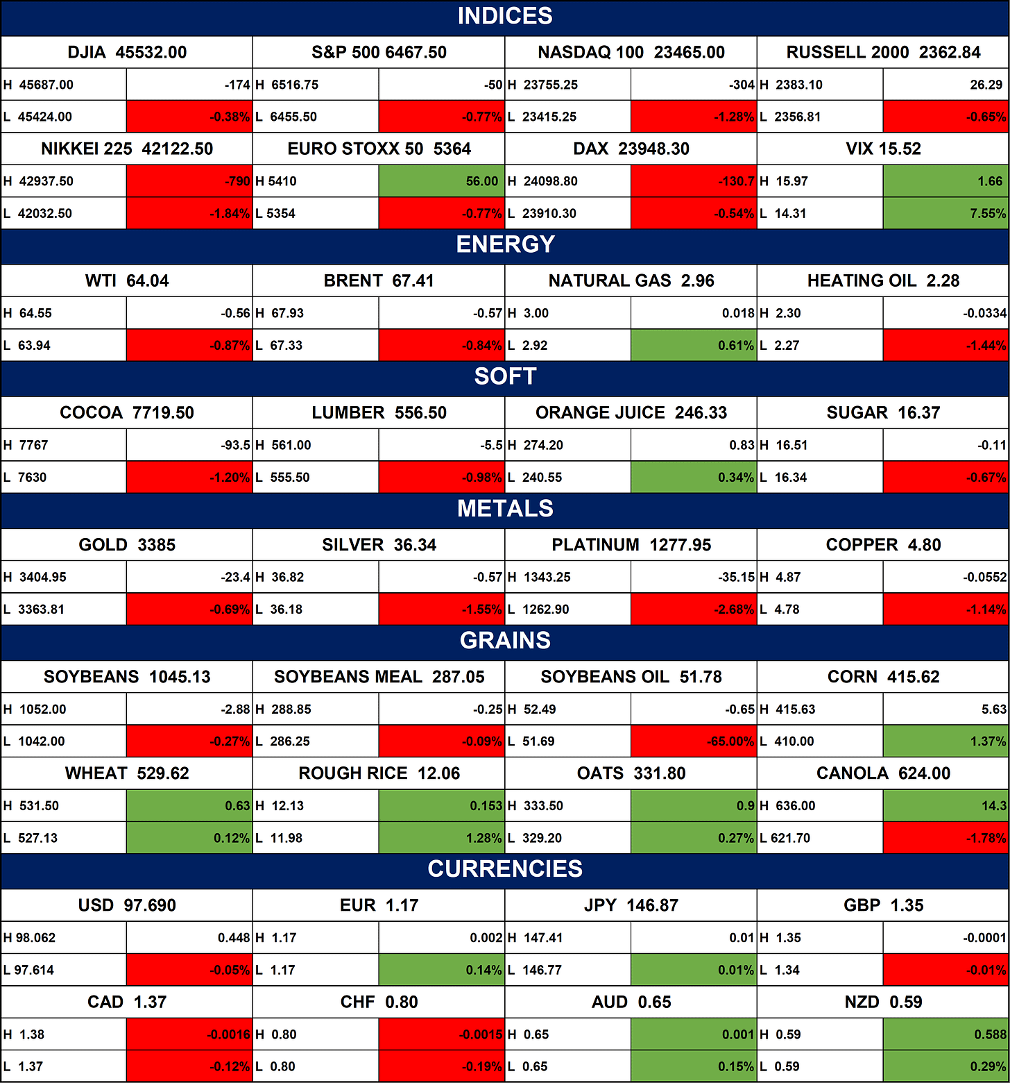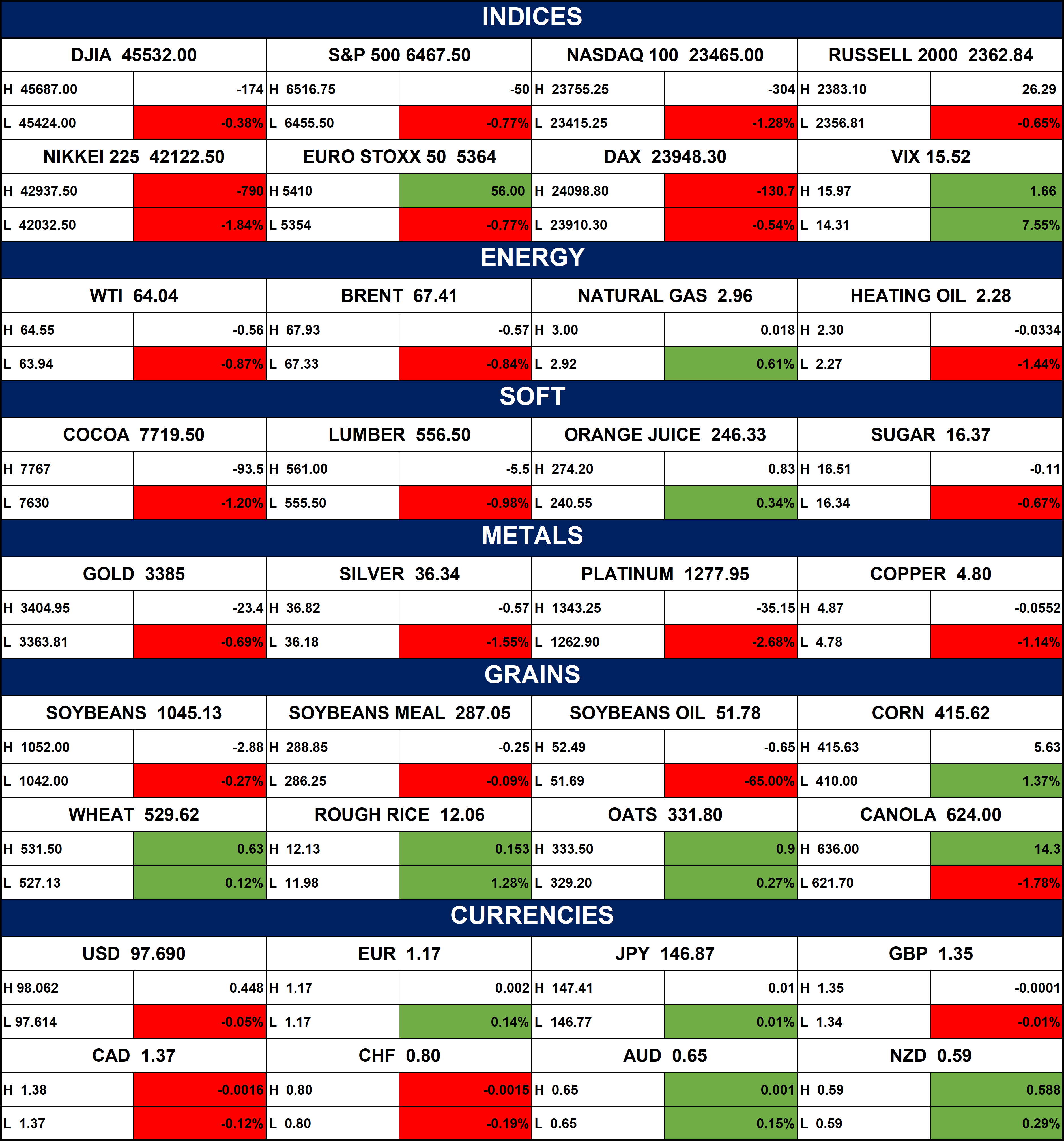 The table below Depicts that markets showed broad weakness, with global stock indices mostly down notably the Nikkei 225 and NASDAQ 100 while Euro Stoxx 50 was the only major gainer. Energy and metals declined, though natural gas edged up. Soft commodities mostly fell, except for a small rise in orange juice. Grains were mostly positive, led by gains in corn, rough rice, and wheat, while canola dropped. The VIX spiked over 7%, signaling rising market volatility. Currencies remained largely flat with minor movements.