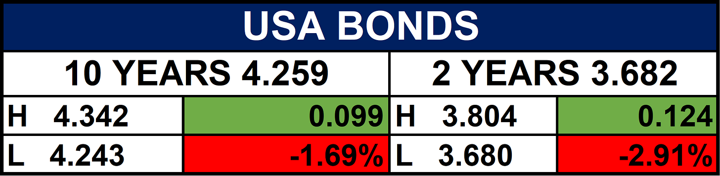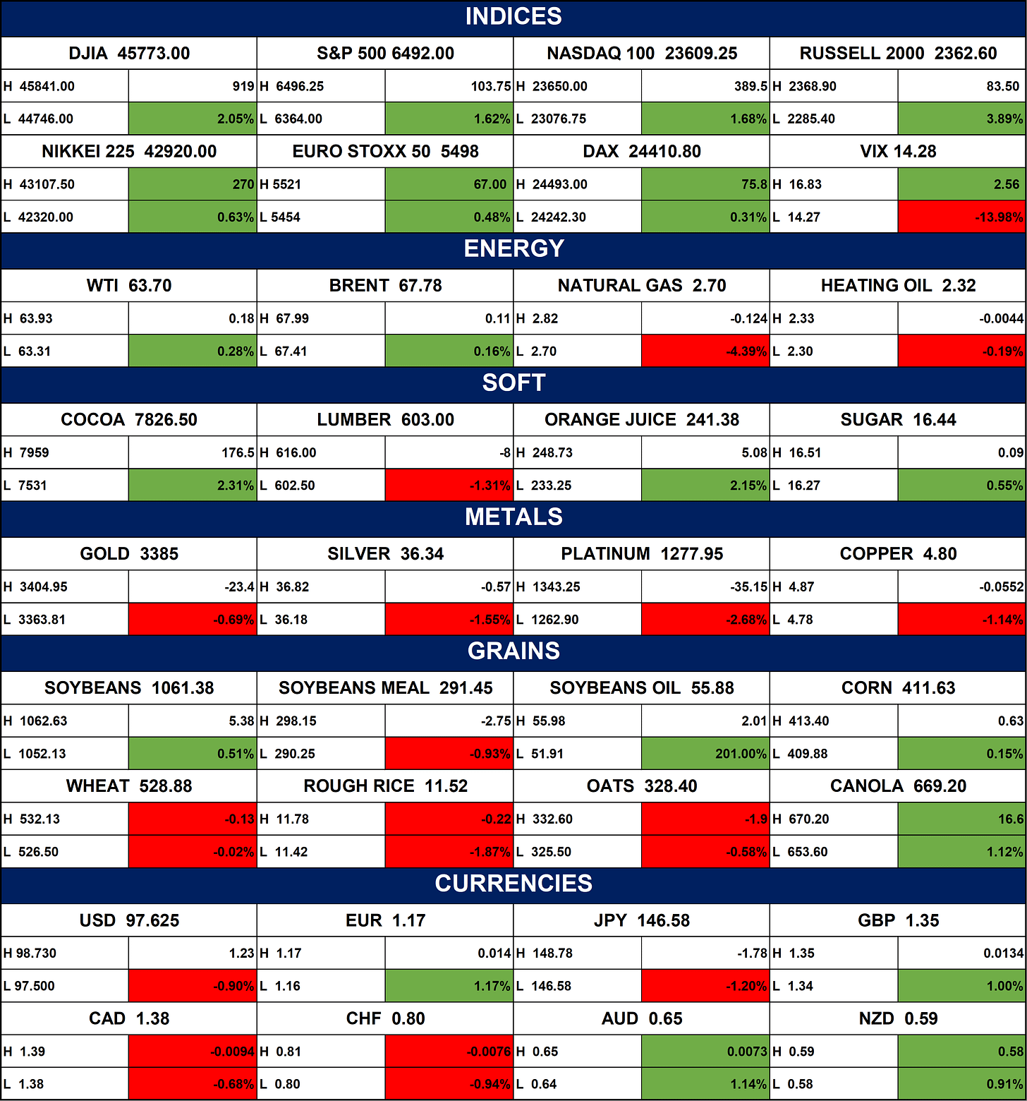 The table below Depicts Global stocks surged, led by the Russell 2000 and DJIA, while volatility (VIX) dropped sharply. Energy prices mostly rose, except natural gas, which fell. Soft commodities like cocoa and orange juice gained; metals declined across the board. Soybean oil led gains in grains. The USD slightly weakened, while EUR, AUD, and NZD strengthened.