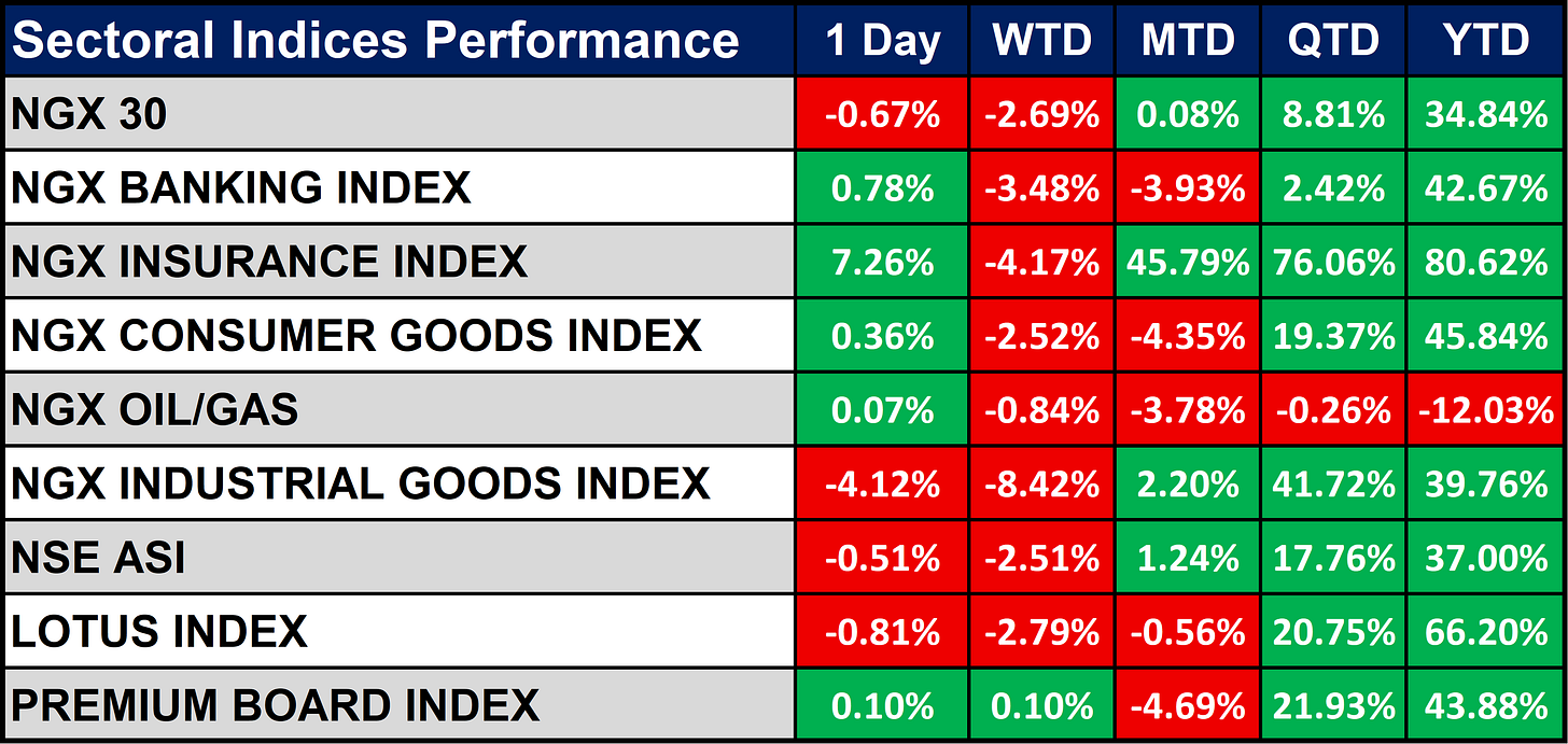 The table below shows that the NGX Insurance Index leads across most periods, especially QTD and YTD. Conversely, the Oil/Gas sector remains weak, being the only one in the red YTD. The market showed a mixed 1-day performance, but weekly returns are mostly negative.