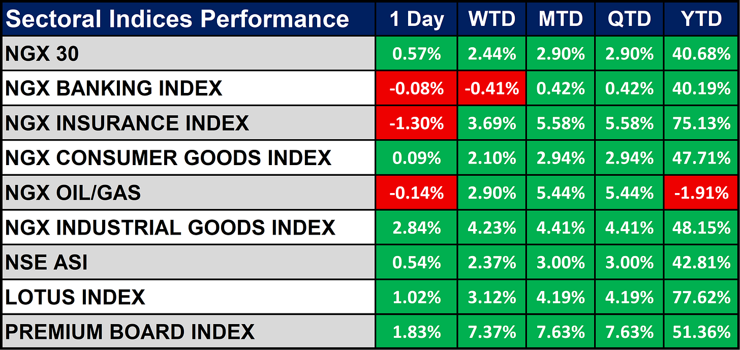 The table below shows that the NGX sectoral indices show strong overall performance, with most sectors posting gains across all timeframes. The LOTUS Index and NGX Insurance Index lead year-to-date, up 77.62% and 75.13% respectively, while the Oil/Gas Index remains the only laggard at -1.91% YTD. Short-term momentum is strong across the board, especially in the Premium Board Index, which posted the highest gains over the past day (1.83%) and week (7.37%).