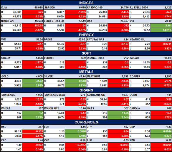 The table below depicts that the Global markets mostly declined, with major indices like the S&P 500, NASDAQ, and DAX all down over 1%. Energy prices fell sharply WTI and Brent dropped. The U.S. dollar weakened slightly, while gold and silver rose amid broad market losses.