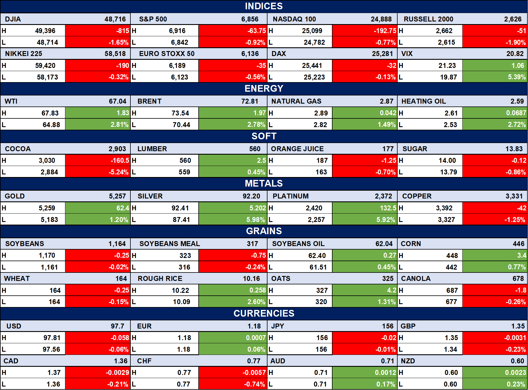 Global equities closed broadly lower, with the DJIA down 1.65% (-815 pts), S&P 500 -0.92%, NASDAQ 100 -0.77%, and Russell 2000 -1.90%, reflecting risk-off sentiment. European markets were mildly weaker (DAX -0.13%, Euro Stoxx 50 -0.56%), while the VIX rose 5.39% to 20.82, indicating higher volatility. In commodities, oil strengthened (WTI +2.81% to $67.04, Brent +2.78% to $72.81), while metals were mixed with Gold +1.20%, Silver +5.98%, and Platinum +5.92%, but Copper -1.25%. Soft commodities were mostly weaker (Cocoa -5.24%), grains mixed, and currencies relatively stable with slight dollar softness. Overall, markets reflect cautious sentiment, rising volatility, and strength in energy and precious metals.