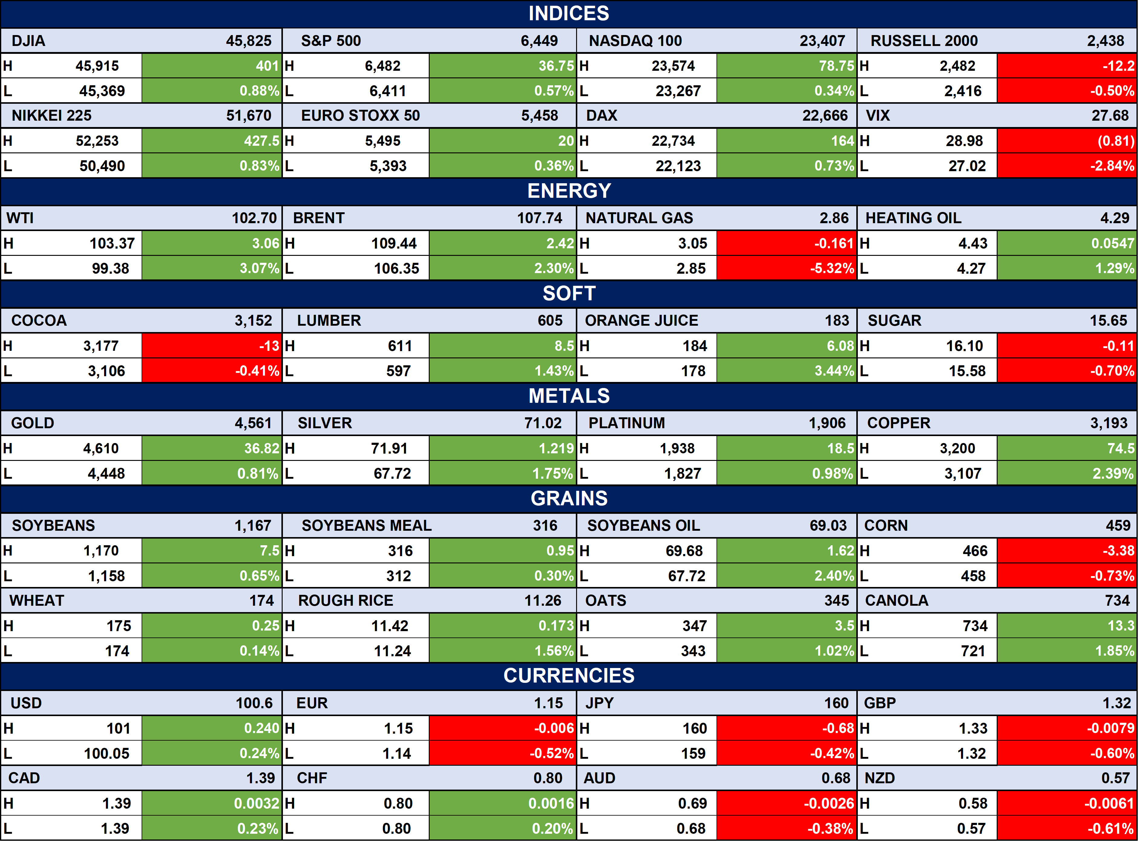 The table below depicts that the Global equities are broadly positive, led by gains in the S&P 500, NASDAQ, and European indices, while small caps (Russell 2000) lag and volatility (VIX) edges lower. Energy prices are mixed with crude oil (WTI, Brent) higher, but natural gas declines sharply; metals and most grains show strength, signaling resilient commodity demand. Currencies are relatively stable, with slight USD strength and mild weakness across EUR, GBP, and commodity-linked currencies, reflecting cautious but steady market sentiment.