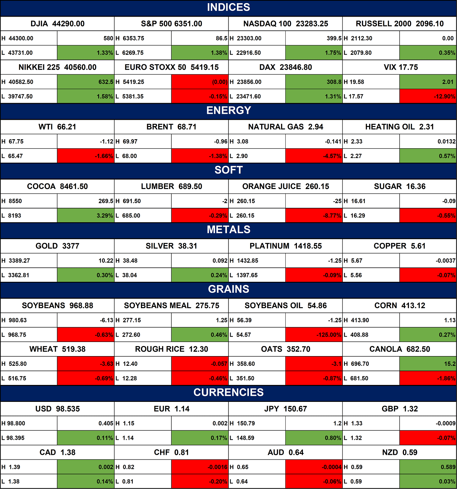 The table below shows that the Global markets rallied on hopes of U.S. interest rate cuts after weak jobs data. Major indices like the NASDAQ and Nikkei gained over 1.5%. Oil prices fell due to increased OPEC+ output, while natural gas dropped sharply. Commodities showed mixed performance, and the U.S. dollar remained stable.