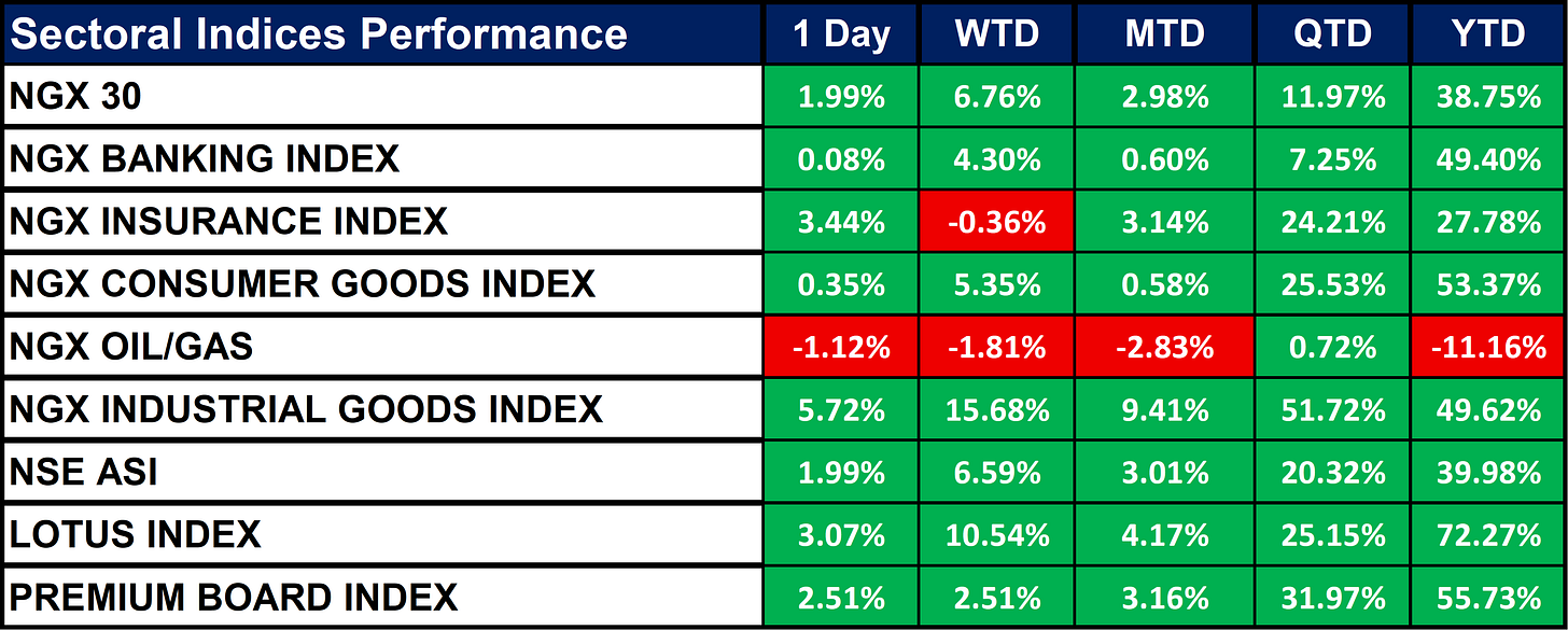 The table below depicts that the NGX sectoral indices posted strong gains across most categories, led by the LOTUS Index (+72.27% YTD) and Premium Board Index (+55.73%). The Industrial and Consumer Goods sectors also showed solid performance. However, the Oil/Gas index was the only major laggard, down -11.16% YTD, reflecting persistent sectoral weakness. Overall, market sentiment remains broadly positive.