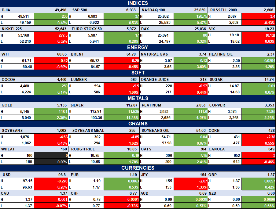 The table below depicts that the U.S. indices mostly gained, with the S&P 500 +0.53% and Nasdaq +0.47%, while the Nikkei 225 fell −0.52% and the Russell 2000 edged down −0.13%. Precious metals surged Gold +2.35%, Silver +11.38%, Platinum +4.07%, and Copper +2.25% while energy prices softened, with WTI −0.42% and Brent −0.29%. Currencies & Grains: The USD softened slightly versus EUR and JPY, while grains showed mixed performance Soybeans down −0.43%, Corn −0.55%, Wheat flat, and Oats +2.41%.