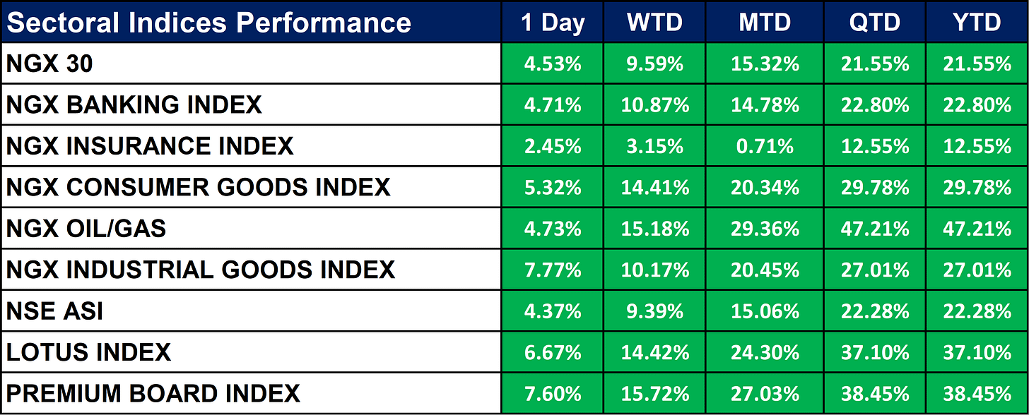 The table below shows that the Nigerian market closed strongly positive, with the NSE ASI gaining 4.37% on the day as all major sectoral indices posted broad-based advances. Industrial Goods (+7.77%), Premium Board (+7.60%), and Consumer Goods (+5.32%) led daily gains, while Banking and Oil & Gas maintained solid momentum. Performance remains robust across time frames, with Oil & Gas (+47.21% YTD), Premium Board (+38.45% YTD), and Lotus Index (+37.10% YTD) driving year-to-date returns.