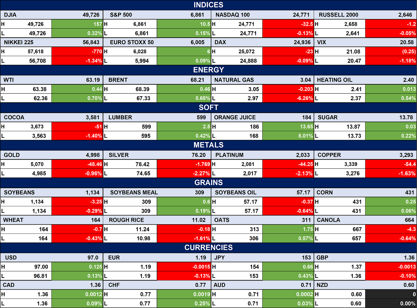 The table below depicts that the Global equities were mixed, with the S&P 500 and Euro Stoxx 50 edging higher while the Nasdaq 100, Russell 2000, and Nikkei 225 posted declines, reflecting cautious investor sentiment. Energy prices strengthened as WTI and Brent crude advanced, while metals broadly weakened with declines in gold, silver, platinum, and copper; soft commodities showed mixed performance. The U.S. dollar firmed slightly against major peers, commodities-linked currencies were mostly stable to positive, and natural gas recorded a notable drop despite broader resilience across energy markets.