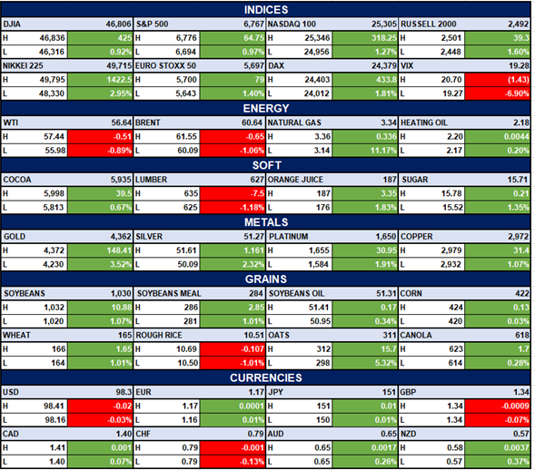 The table below depicts that the Global equities traded mostly higher with major indices like the S&P 500, Nasdaq, and Nikkei 225 gaining over 1%, while volatility (VIX) fell sharply by 6%. Energy markets were mixed WTI and Brent slipped slightly, but Natural Gas surged over 11% on strong demand.