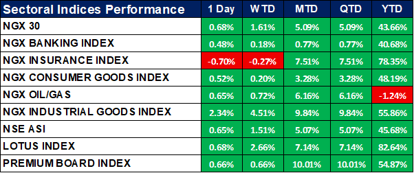 Year-to-date performance remains strongest in the Lotus (+82.6%) and Insurance (+78.35%) indices, reflecting strong investor rotation into defensive and Sharia-compliant stocks. The NGX Oil & Gas Index was the lone laggard year-to-date (-1.24%), while the broader NGX ASI gained 0.65% for the day.