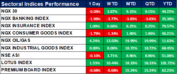 Overall, the NSE ASI slipped 0.10% but remained up 3.71% week-to-date and 8.96% month-to-date. Year-to-date, the Insurance (+79.57%) and Lotus (+101.72%) indices remain the top performers, reflecting strong sector momentum.