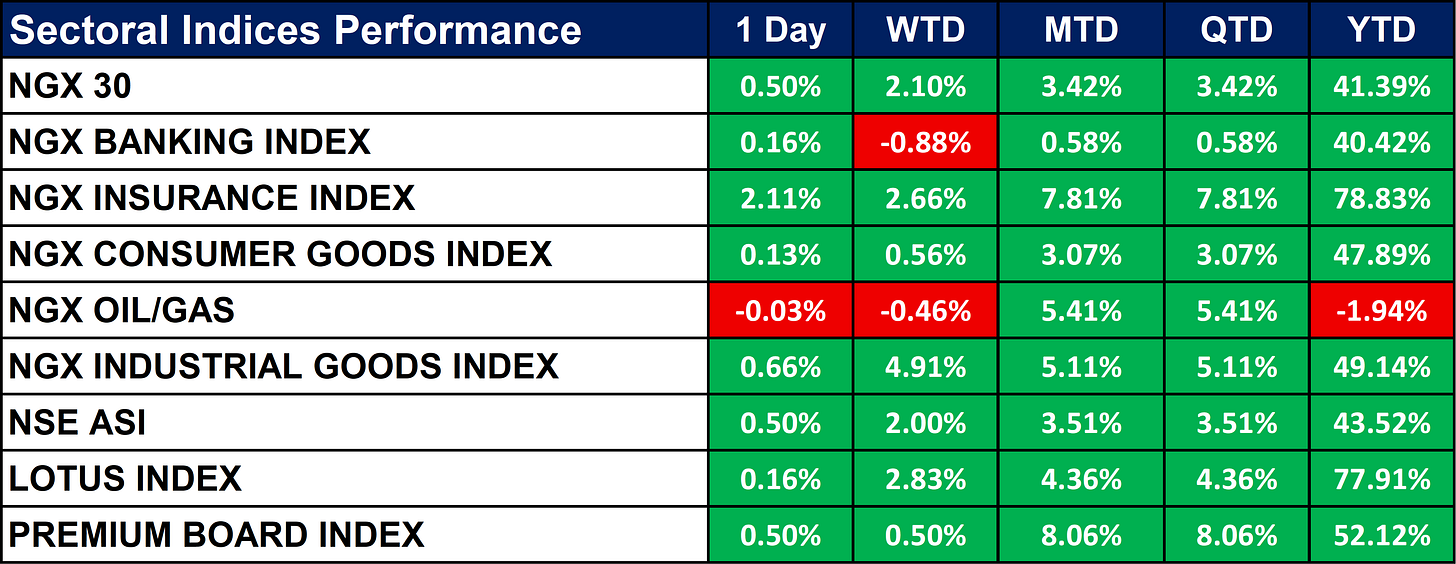 The table below depicts that the NGX market closed broadly positive, led by gains in the Insurance (+2.11%) and Industrial Goods (+0.66%) indices. Year-to-date, the Insurance Index remains the top performer at +78.83%, followed by Lotus (+77.91%) and Consumer Goods (+47.89%). However, the Oil/Gas sector continued to lag, down -0.03% for the day and -1.94% year-to-date.