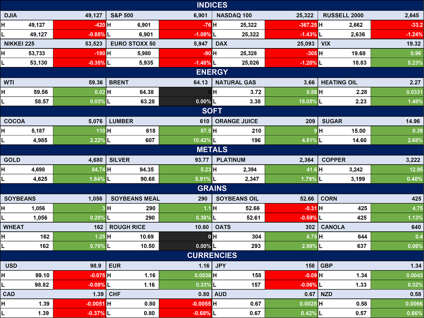 The table below depicts that the Global equities traded broadly lower, with US and European indices in the red and volatility (VIX) edging higher, reflecting cautious risk sentiment. Commodities were mixed but largely supportive, as energy prices firmed, soft commodities and metals posted gains, while grains were mostly stable with limited downside. In FX markets, the dollar was marginally weaker against major peers, while commodity-linked and select emerging currencies showed modest resilience.
