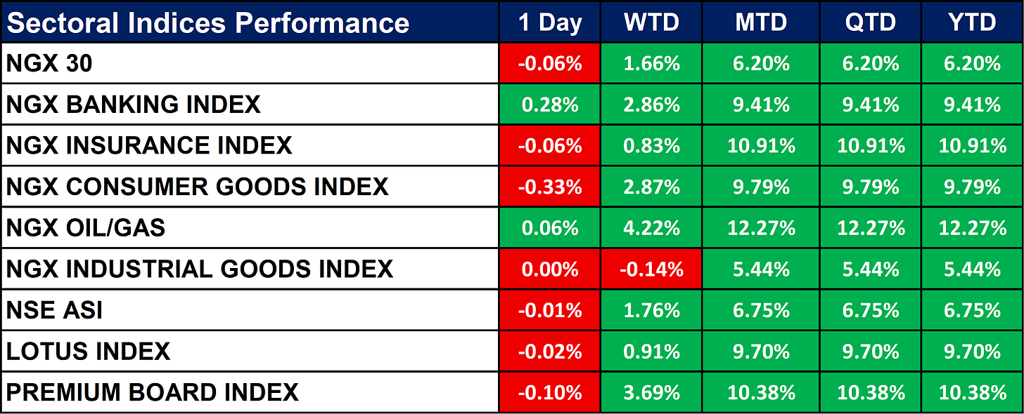 The table below depicts that the NGX sectoral performance was mixed on the day, with marginal declines across most indices, while Banking (+0.28%) and Oil & Gas (+0.06%) closed slightly positive. Week-to-date and month-to-date returns remain firmly positive, led by Oil & Gas, Banking, Consumer Goods, and the Premium Board, reflecting sustained buying interest. Year-to-date performance is broadly strong across sectors, with Oil & Gas and Insurance emerging as top outperformers on the NGX.