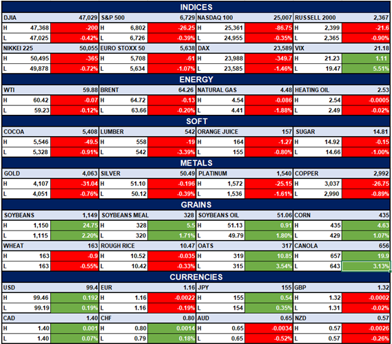 In commodities, energy and metals were broadly weaker, while grains such as soybeans, corn, and canola showed notable intraday strength.