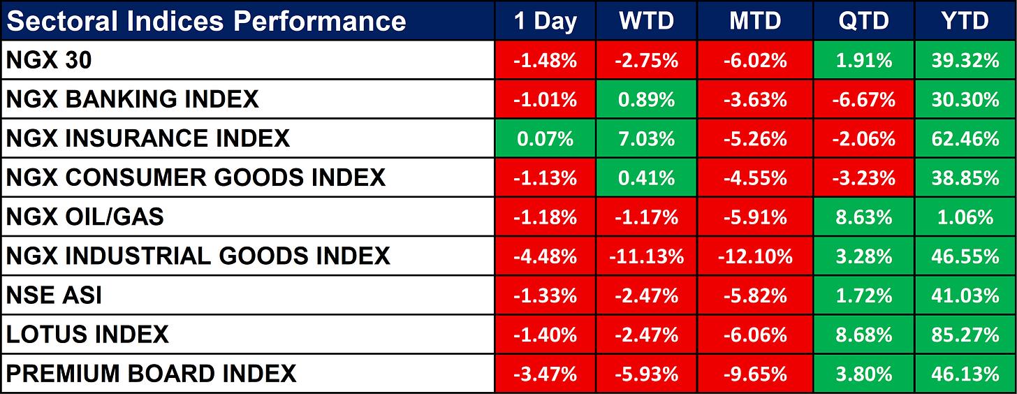 The table below depicts that Most sector indices posted 1-day and month-to-date declines, with Industrial Goods and Premium Board showing the deepest losses.