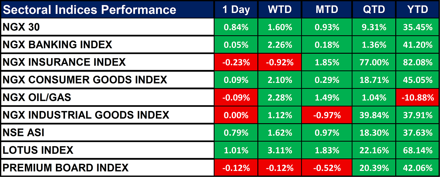 The table below depicts that the NGX started the week strong on Monday, with broad gains across major indices. Banking (+2.26%), Consumer Goods (+2.10%), Oil/Gas (+2.28%), and Lotus (+3.11%) drove the rally, while Insurance (–0.92%) and Premium Board (–0.12%) declined. Year-to-date, the market remains robust with the ASI up +37.63%, led by Insurance (+82.08%) and Lotus (+68.14%), though Oil/Gas (–10.88%) continues to underperform.