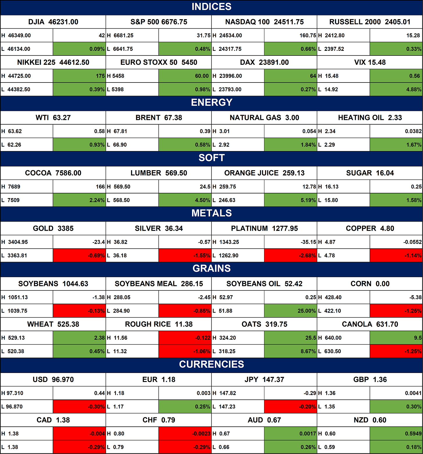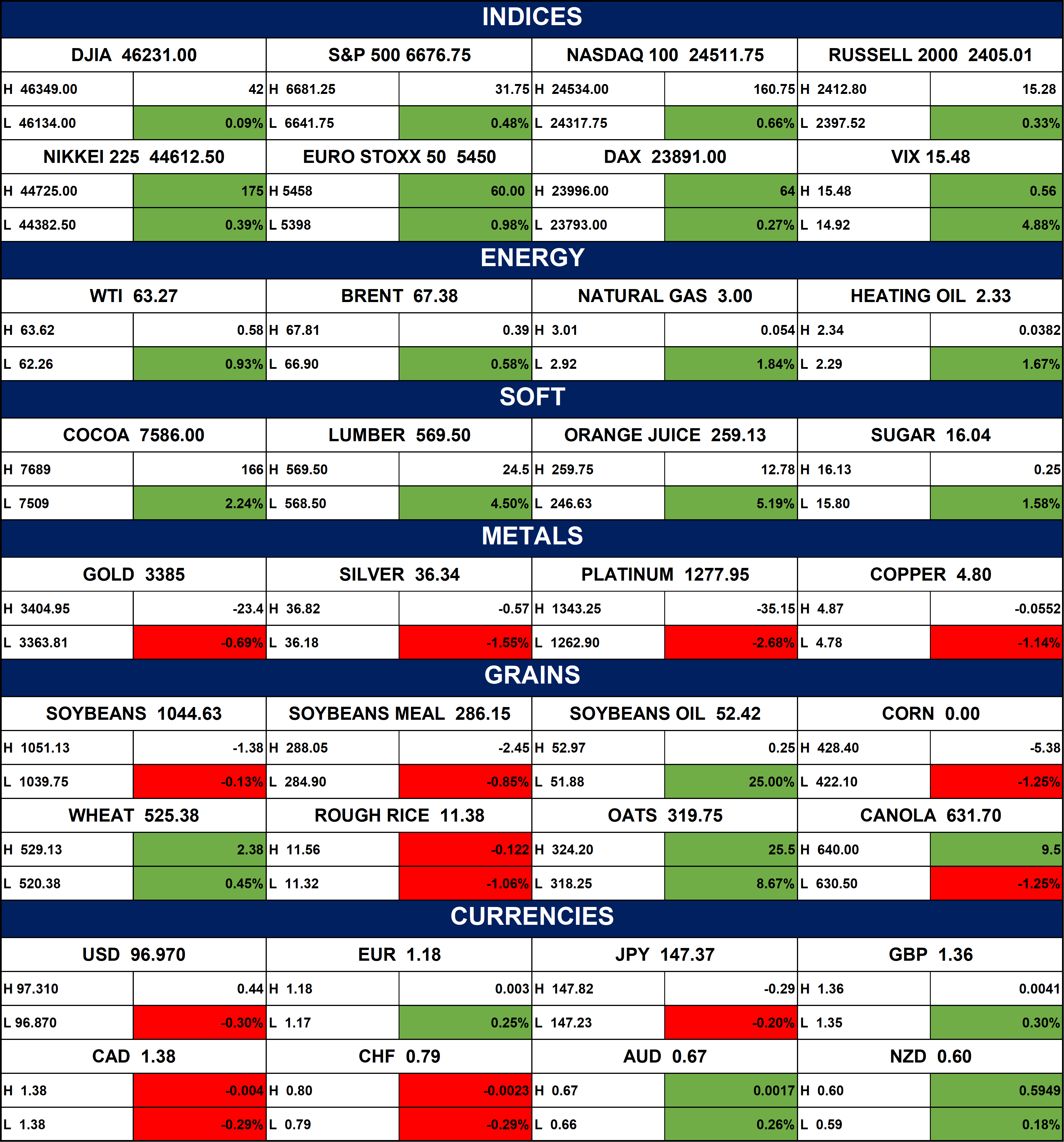 The table below shows that the Global stocks gained across major indices, oil and energy prices rose, and soft commodities like cocoa, lumber, and orange juice saw strong rallies. Metals declined, with gold, silver, platinum, and copper all down. Grains were mixed oats surged, while corn and canola fell. The U.S. dollar weakened slightly, while the euro and New Zealand dollar strengthened.