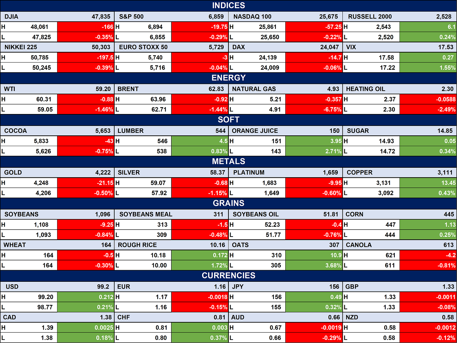 The table below depicts that the Global equity indices mostly pulled back, with the Dow, S&P 500, Nasdaq, Euro Stoxx 50 and Nikkei all closing lower, reflecting broad risk-off sentiment. Energy markets weakened, as WTI and Brent fell over 1%, while natural gas dropped sharply, signalling demand softness. Commodities were mixed, precious metals slipped, most agricultural grains declined, but soft commodities like orange juice and lumber gained; major currencies traded in tight ranges with slight strength in USD and CAD.