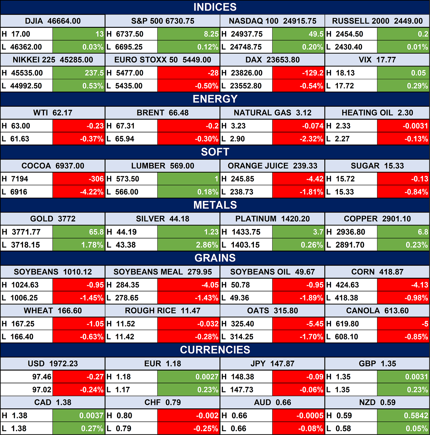 The table below shows that the Global stocks were mixed with U.S. indices edging up while European markets slipped. Gold and silver rose, but oil and most agricultural commodities fell. The dollar eased, while the euro, pound, and Canadian dollar gained slightly.