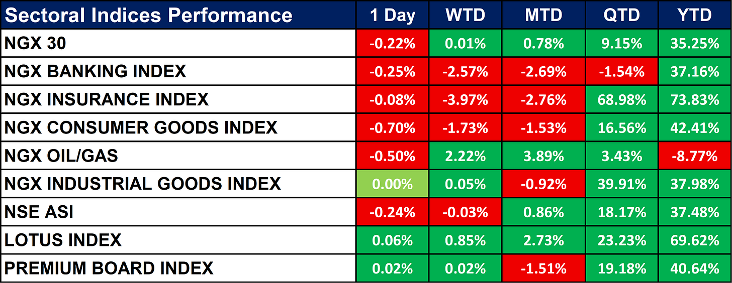 The table below depicts that the NGX sectoral indices closed mixed, with most sectors posting slight daily losses. Insurance remains the strongest performer YTD (+73.83%), followed by Lotus (+69.62%) and Consumer Goods (+42.41%).