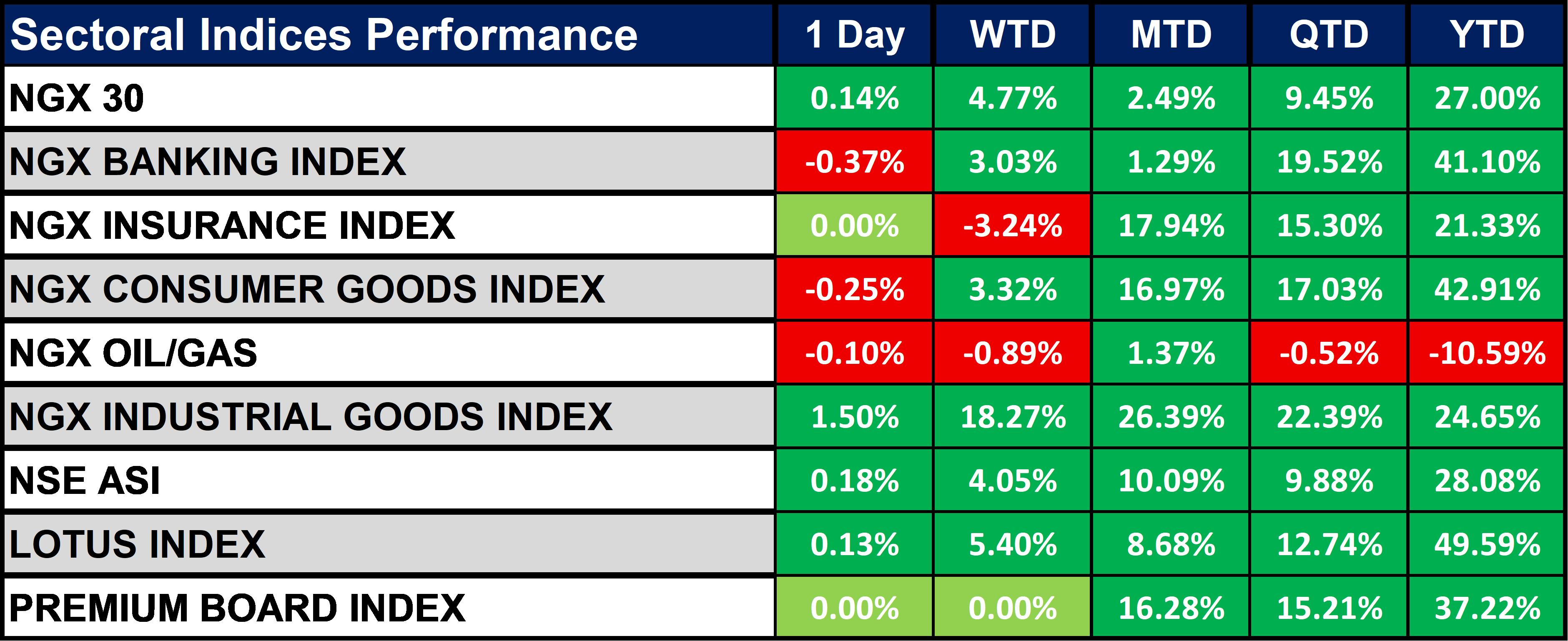 The table below depicts that most NGX sectors closed positive YTD, led by Lotus Index (+49.6%), Consumer Goods (+42.9%), and Banking (+41.1%).