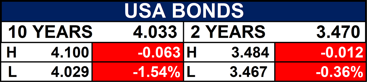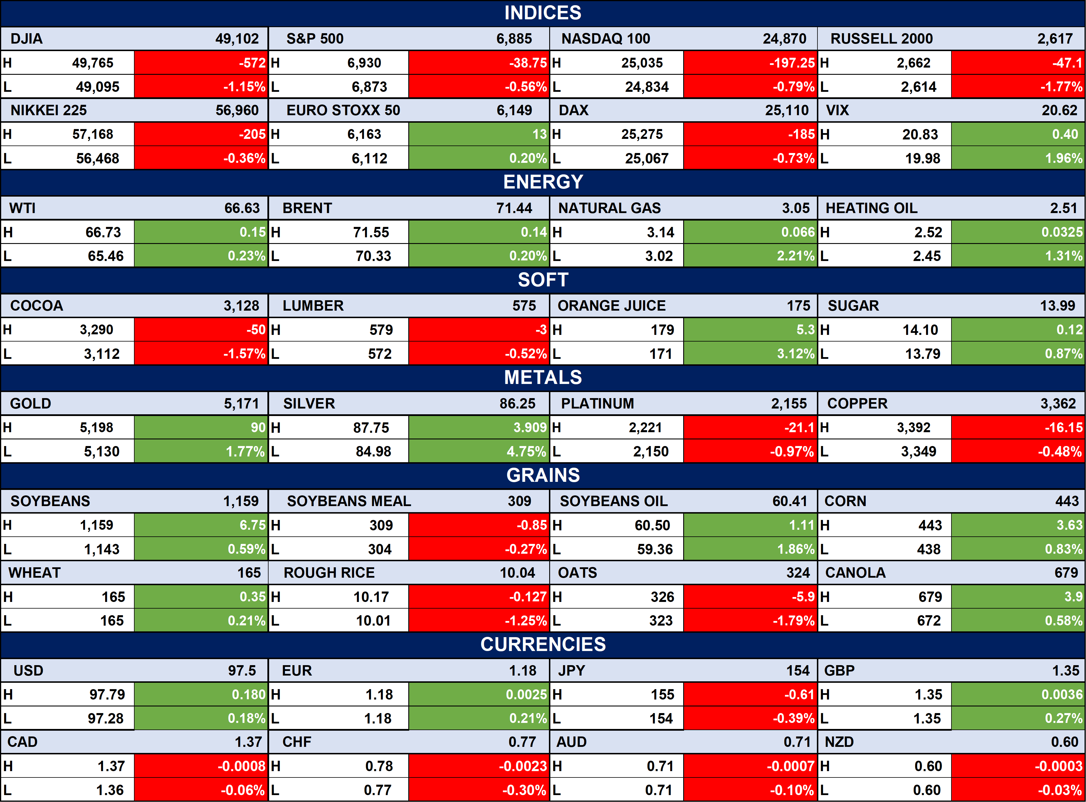 The table below depicts that the U.S. equities closed lower across major indices, with the NASDAQ and Russell 2000 leading declines, while European markets were mixed and volatility edged higher. Energy prices strengthened as WTI, Brent, and natural gas posted gains, precious metals advanced (gold and silver up), while copper and platinum declined. Agricultural commodities were mixed with gains in corn and soybeans, currencies showed a firm USD and EUR, while JPY and AUD weakened slightly.