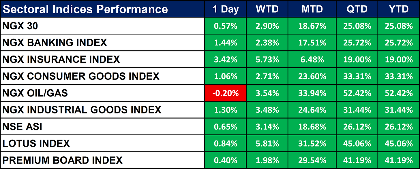 The table below shows that the NGX sectoral indices closed broadly positive, led by strong gains in Insurance (+3.42%), Banking (+1.44%), and Industrial Goods (+1.30%), while Oil & Gas dipped slightly (-0.20%). Month-to-date and year-to-date performance remains robust across sectors, with Oil & Gas (+52.42% YTD), Lotus (+45.06%), and Premium Board (+41.19%) leading returns. The broader market remains firmly bullish, as the NGX 30 and NSE ASI post solid double-digit gains across MTD, QTD, and YTD periods.