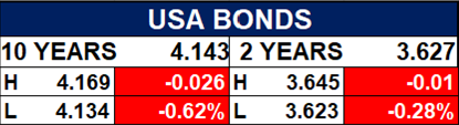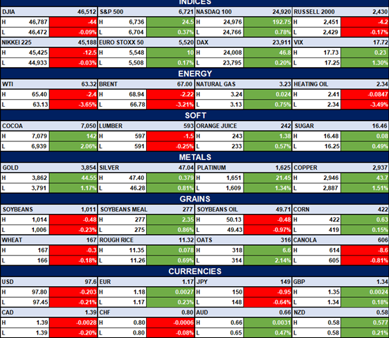 The table below shows mixed market performance across asset classes. Equities (S&P 500, NASDAQ 100, DAX) posted gains, while some like Nikkei 225 and Russell 2000 declined. Energy prices fell (Brent, WTI), metals and soft commodities mostly rose, and currencies traded mixed with the USD slightly weaker.