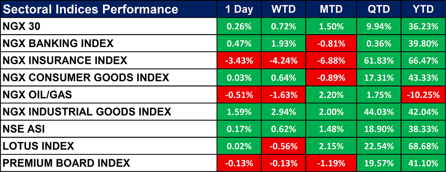 The table below depicts that the NGX indices showed mixed performance: Industrial Goods (+1.59%) and Banking (+0.47%) gained, while Insurance (-3.43%) and Oil/Gas (-0.51%) declined. Quarter-to-date, Insurance (+61.83%) and Industrial Goods (+44.03%) led gains, while Oil/Gas fell (-10.25% YTD). Overall, NSE ASI is up +38.33% YTD, reflecting strong market growth despite sectoral divergences.