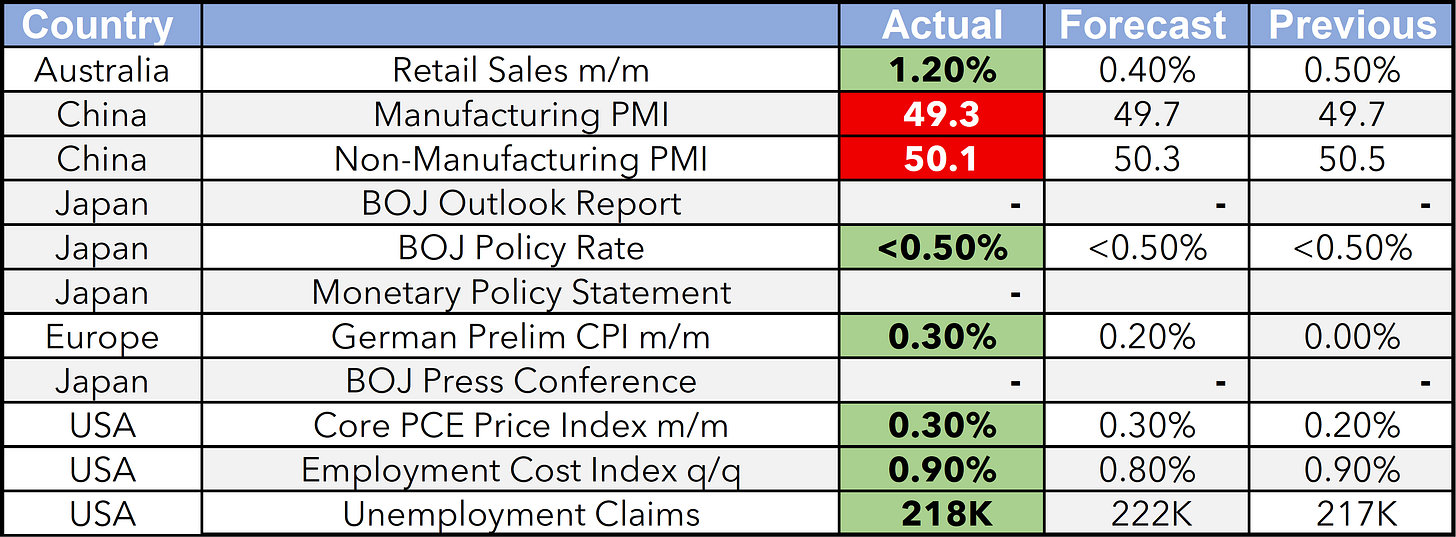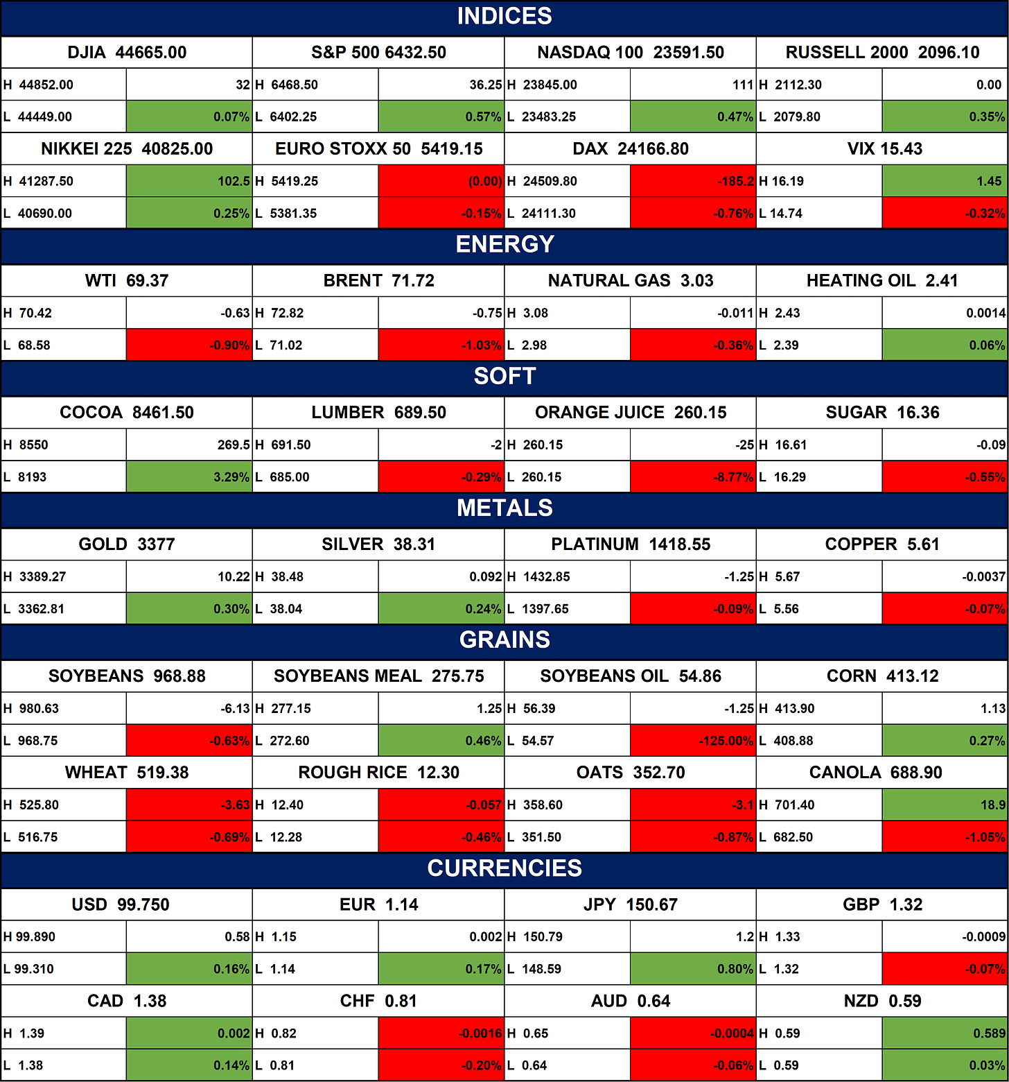 The table below depicts that the Markets were mixed across the board. U.S. and Asian indices posted modest gains, while European markets like the DAX declined. Energy prices fell, with WTI and Brent crude both down. Cocoa surged over 3%, but orange juice plunged nearly 9%. Precious metals saw slight gains, while grains mostly declined. In currencies, the U.S. dollar and Japanese yen strengthened, while the Swiss franc and British pound dipped slightly.