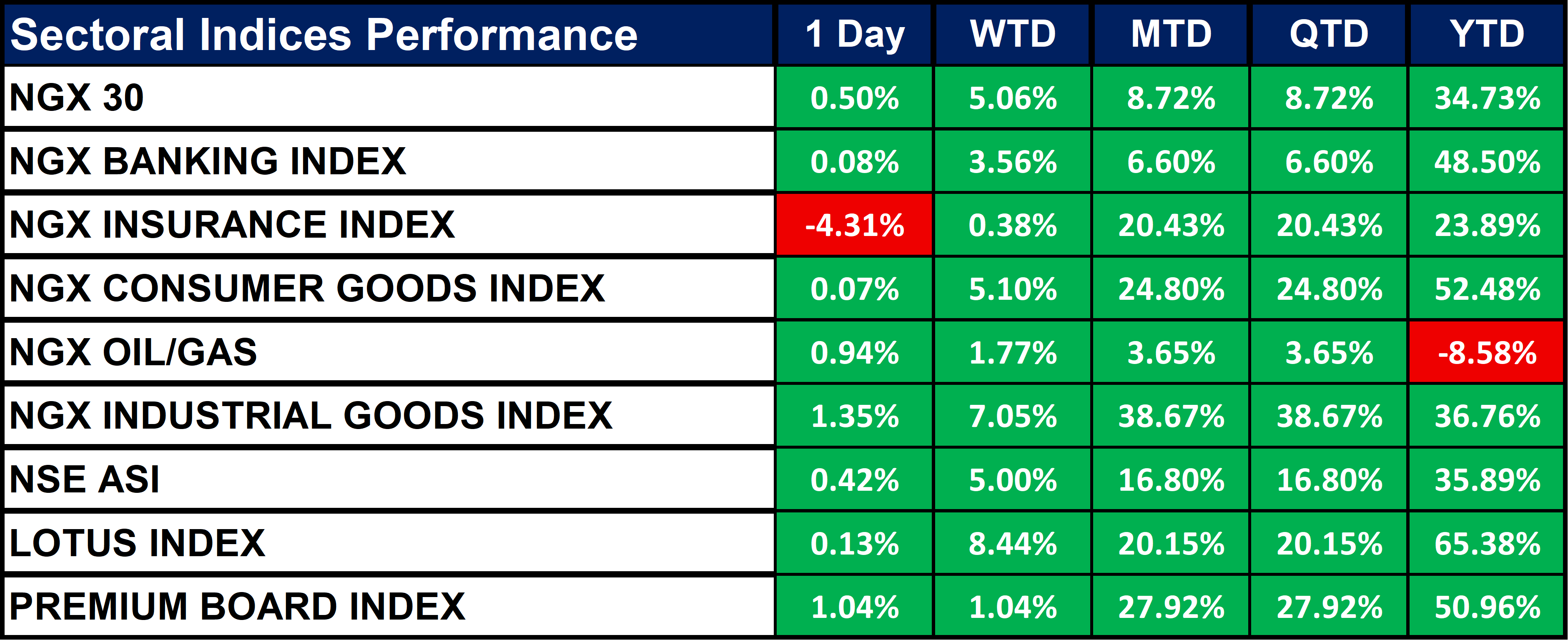 The table below shows that the NGX sectoral indices showed broad gains, with Consumer Goods, Industrial Goods, and Lotus Index leading YTD performance. Despite a sharp 1-day drop in Insurance (-4.31%), it remains positive overall. Oil/Gas is the only sector in decline YTD (-8.58%). Market sentiment remains largely strong across most sectors.