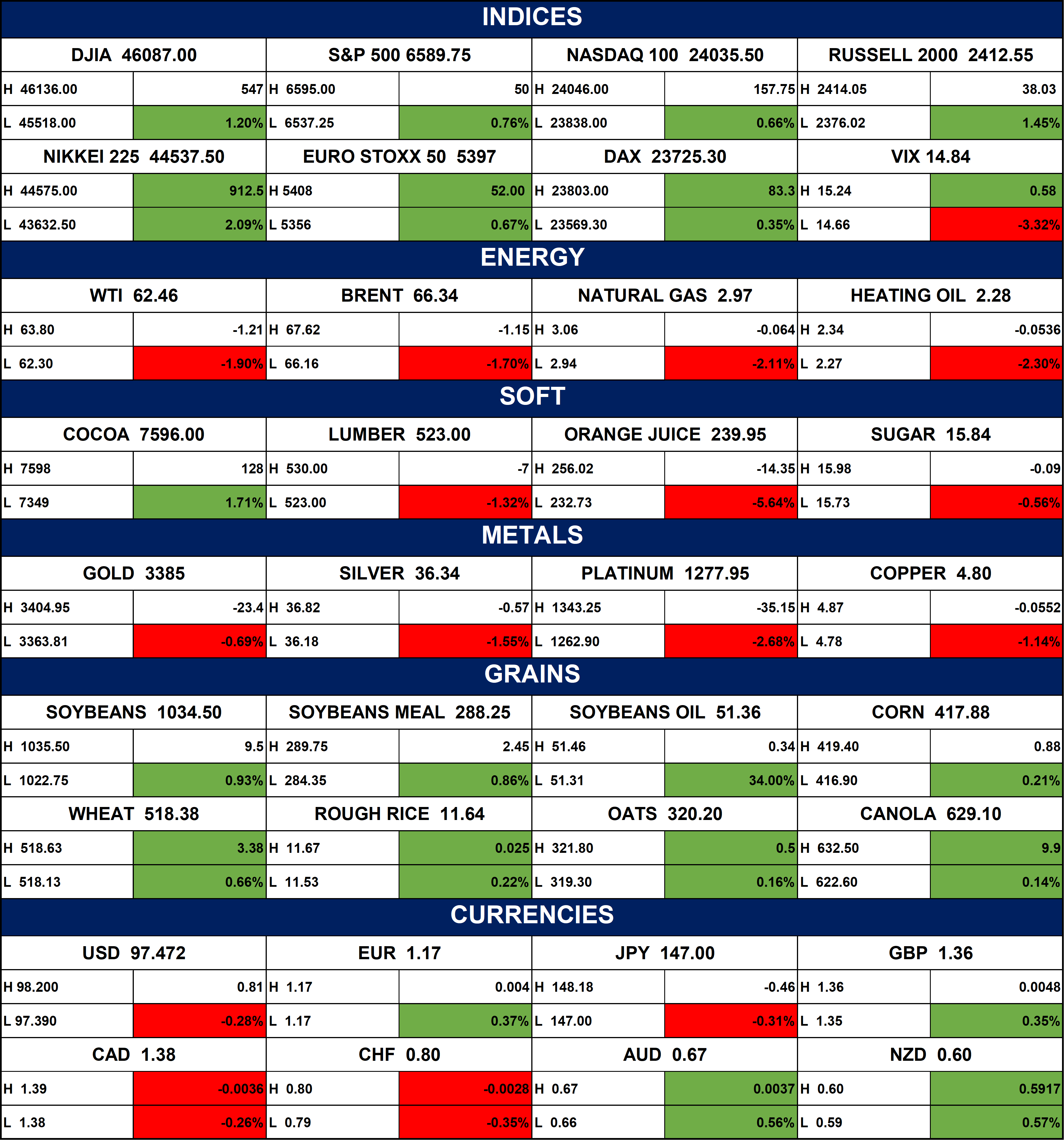 The table below depicts that the Global stocks rallied, led by U.S. and Asian indices, while volatility eased. Commodities were mixed: grains gained strongly (soybean oil surged), but energy and metals fell. The U.S. dollar weakened against most major currencies.
