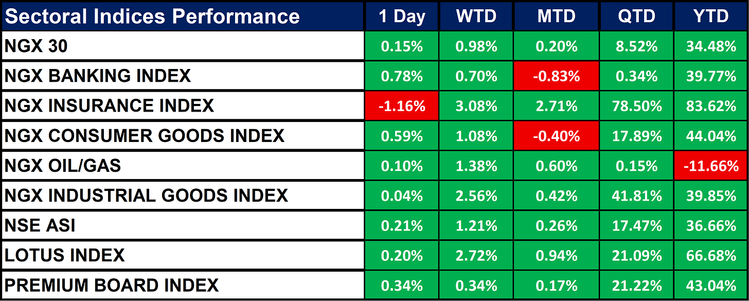 The table below shows that the Nigerian stock market is broadly strong, with the NSE ASI up 36.66% YTD. Sector performance is led by Insurance (+83.62% YTD), followed by strong gains in Consumer Goods, Banking, Industrial Goods, Lotus, and Premium Board indices (all above +39% YTD). However, the Oil & Gas index remains the weakest performer, down –11.66% YTD, despite short-term positive moves. Overall, the market shows resilience with Insurance driving growth while Oil & Gas lags.