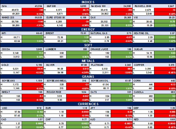Global markets are mixed, with the DJIA (+0.29%) and S&P 500 (+0.85%) advancing, while the NASDAQ 100 (-1.55%) and Russell 2000 (-0.60%) declined, reflecting rotation out of tech into broader equities.
