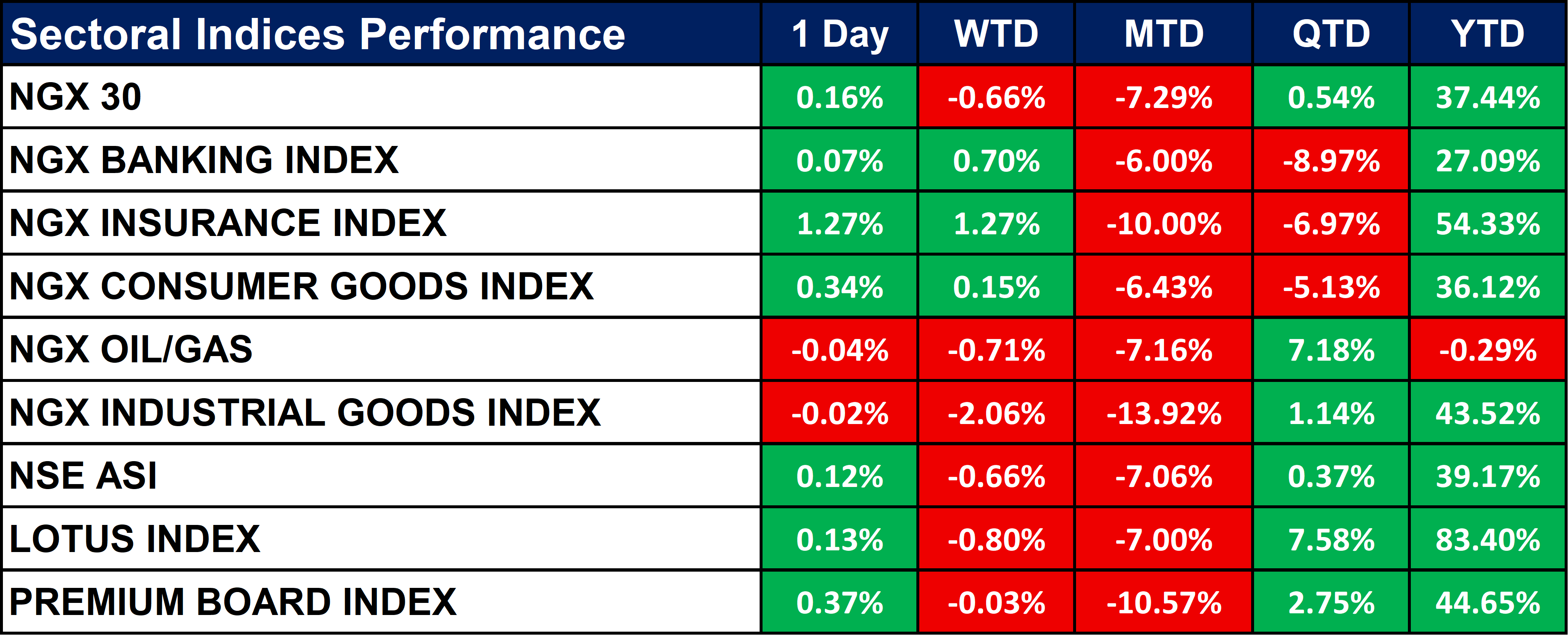 The table below shows that the NGX saw mild gains across major indices, with Insurance (+1.27%) leading the market on a 1-day basis.