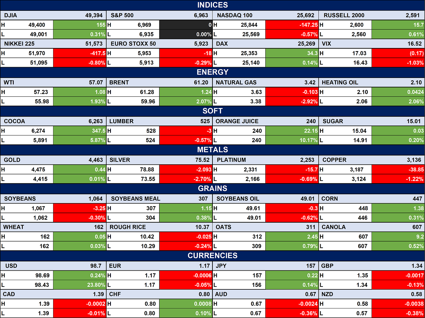 The table below depicts that the Global equity markets showed mixed performance, with U.S. indices slightly higher (DJIA +0.31%, Russell 2000 +0.61%) while major Asian and European indices fell, led by Nikkei 225 (-0.80%) and Euro Stoxx 50 (-0.29%).
