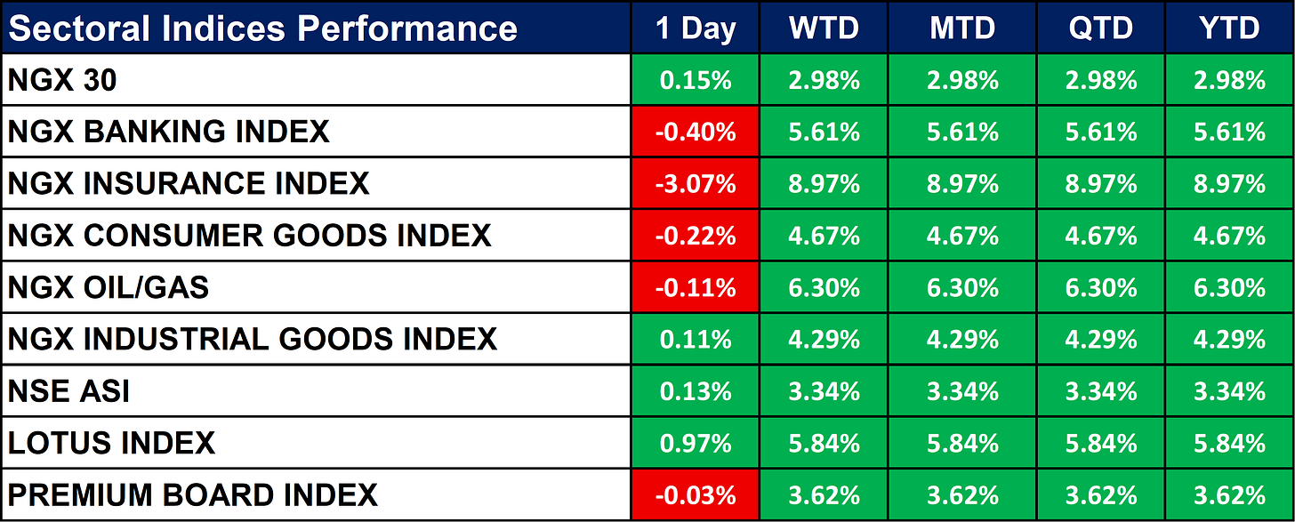 The table below shows that the NGX market showed modest mixed performance today, with the overall NGX 30 up slightly by 0.15% while key sectors like Banking (-0.40%), Insurance (-3.07%), and Consumer Goods (-0.22%) retreated. Oil & Gas (-0.11%) and Premium Board (-0.03%) were also marginally down, while Industrial Goods (+0.11%) and broader indices like NSE ASI (+0.13%) and Lotus Index (+0.97%) recorded gains. On a weekly to year-to-date basis, all sectors remain positive, led by Insurance (+8.97%) and Oil & Gas (+6.30%), signaling sustained market momentum despite daily fluctuations.